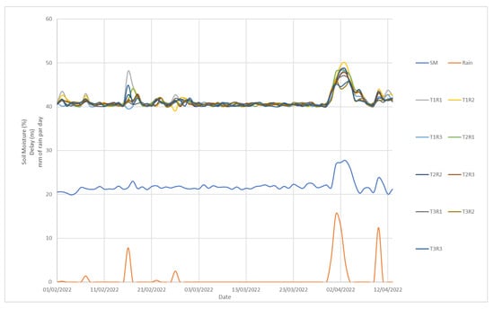 Graph of fallen rain in mm, average measurements of soil moisture (SM in %) and delays between signals on Tx and Rx antennas in ns from 1 February until 15 April 2022.