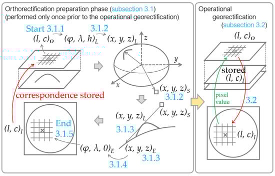 Orthorectification is a process that relates a pixel position in an output image to a pixel position in an input image by considering the influence of the pixel height. Notably, the output image is usually projected onto a map by a certain projection method. Because we used an indirect method, we implemented an orthorectification process as a series of coordinate transformations from the two-dimensional “output image” to the “input image”. During this transformation process, three-dimensional geospatial coordinates were used as intermediate coordinates. Figure 1 shows the computational steps of the orthorectification algorithm implemented in the present study. All the steps will be explained individually in the following subsections, along with the actual implementation.