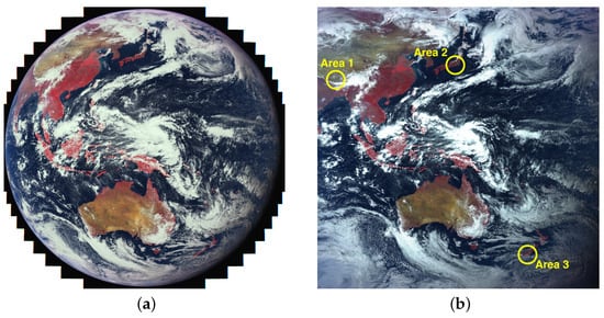 Himawari-8 AHI Full Disk Data observed at 4:00 UTC on 8 April 2022: (a) false-color composite of the original image and (b) the orthorectified image. Three areas were used for comparison with the Sentinel-2 MSI image (Figure 3).
