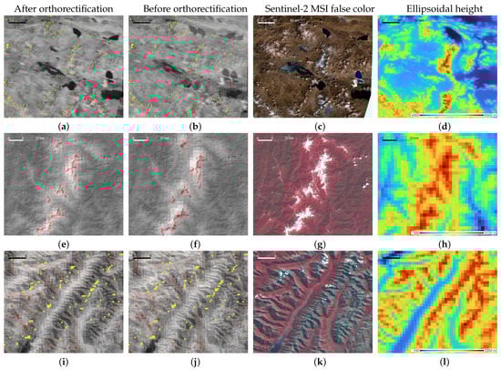 Comparison of orthorectified and nonorthorectified Himawari-8 AHI images overlaid with the corresponding Sentinel-2 MSI image. Left panels (a,e,i) are orthorectified AHI band 4. Panels (b,f,j) are the same but without orthorectification. Panels (c,g,k) are false-color MSI images. Left panels (d,h,l) are ellipsoidal height. Red in the left two panels indicates bright pixels in the MSI image. Yellow pixels show the pixel locations where occlusions were detected on the basis of the ellipsoidal height data with a resolution of 0.005°. (a–d) are the results for the Tibet Autonomous Region in China. Likewise, (e–h) are the results for the Akaishi Mountains in Japan, and (i–l) are the results for the Otago Region in New Zealand.