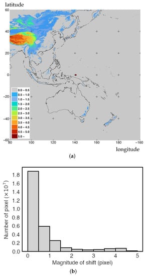 Figure 4a,b show the pixel displacement of the AHI Full Disk image by the orthorectification process in terms of the pixel size at 1 km spatial resolution. In general, as a target pixel is located farther from the subsatellite position and its ellipsoidal height is greater, the displacement by the orthorectification increases. The histogram in Figure 4b shows the frequency distribution of the pixel displacement only for the land pixels including inland water. Approximately 61% of the pixels are shifted less than 0.5 pixels; these pixels mostly correspond to locations in Southeast Asia, Australia, the North China Plain, and lower-altitude areas in Siberia. By contrast, approximately 7.3% of the land-area pixels are shifted more than 3 pixels; the majority of these pixels correspond to locations in the Tibetan Plateau and the Mongolian Plateau. We note that the largest displacement of approximately 7.2 pixels also occurs for pixels in these regions. For the area of Japan, the shift values range from 0.01 to 2.28 pixels, with the maximum corresponding to the top of Mt. Fuji.