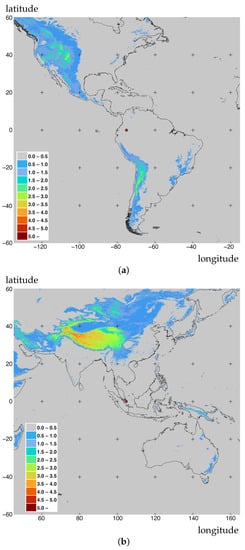 We attempted to extend the above results to cases of other GEO sensors and then attempted to draw universal conclusions in the context of land remote sensing with the new-generation GEO satellites. We first repeated the same computation of pixel displacement using the orthorectification shown in Figure 4a to the cases of the GOES-16 ABI and FY-4A AGRI. The results are plotted in Figure 5, where the latitude range is limited from 60°N to 60°S for both sensors. The longitude range is defined independently for these sensors, ranging from 135°W to 15°W for the GOES-16 ABI and from 45°E to 165°E for the FY-4 AGRI.