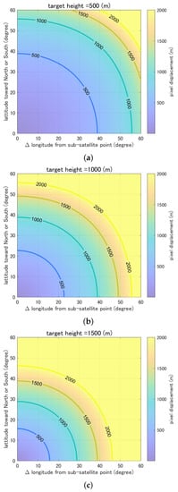Figure 6 shows the results of displacement distance with contours for assumed pixel heights of (a) 500 m, (b) 1000 m, and (c) 1500 m. As evident in the figures, the displacement distance increases as both the assumed height of the pixel and the relative distance from the subsatellite point increase. Most notably, for any surface whose height from the reference ellipsoidal surface is greater than 500 m (Figure 6a), the displacement also becomes equal to or greater than 500 m in the locations whose relative latitude or longitude is greater than 40°. The displacement becomes even worse in the cases of 1000 m (Figure 6b) and 1500 m (Figure 6c). Because the elevation of mountainous regions is often greater than 500 m in the middle-to-high latitudes of the Northern Hemisphere, we expected to see a larger influence. Lastly, we note that the displacement direction for each pixel is identical to the direction of the position vector of a target pixel.