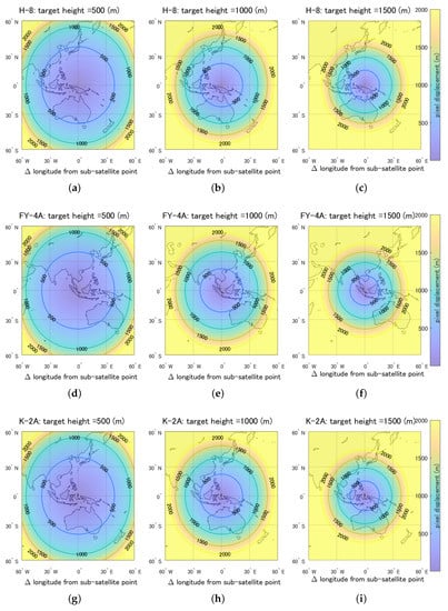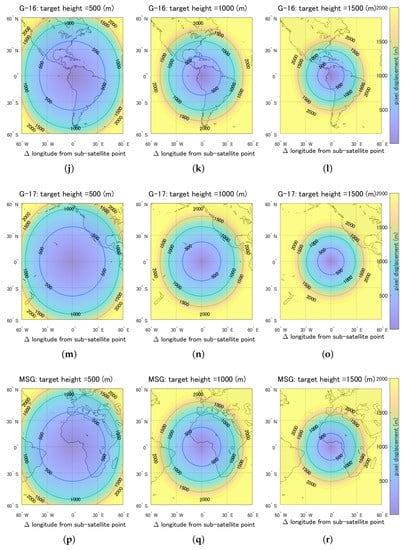 The results shown in Figure 6a–c can be applied to the cases of other GEO sensors by simply shifting the plot area based on the subsatellite points of each GEO satellite. To demonstrate the generality of Figure 6, we considered six GEO satellites plotted row-wise in Figure 7 for the satellites Himawari-8 (a–c), FY-4A (d–f), Geo-KOMPSAT-2A (g–i), GOES-16 (j–l), GOES-17 (m–o), and MSG (p–r). The figures in the left column show the cases for a 500 m target height. Similarly, the results for the 1000 m and 1500 m cases are shown as the figures arranged in the center and left columns, respectively. In all the figures, the coastlines are overlayed on the displacement results.