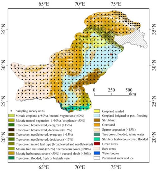 The spatial pattern of land use and sampling survey units in Pakistan (source: Climate Change Initiative—Land Cover 2000 (CCI-LC 2000), European Space Agency, ESA).
