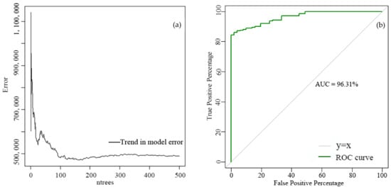 This study used the createDataPartition function in the R environment to randomly divide the sampling unit dataset into a training dataset (80% of the total dataset) and test dataset (20% of the total dataset), which was performed to train the model and test the model’s performance. Spatial interpolation using the randomForest function, according to the traversal modeling results, has the lowest error rate when mtry = 3; when ntree = 300, the error within the model is basically stable (Figure 5a). The receiver operating characteristic (ROC) curve and area under the curve (AUC) values were used to evaluate the performance of the binary classifier; the higher the value of AUC, the better the classification effect of the model. In Figure 5b, the ROC curve is near the upper left corner, and the AUC is 96.31%. The random forest model passed a 10-fold cross-validation and had a model explained degree (R2) of 89.4%, mean absolute error (MEA) of 559.41, and root mean square error (RMSE) of 786.39, showing that the deviation between the fitted and true values of the model is small and that the random forest simulation results were more accurate. The importance of the covariate layers was ranked as R > LS > B > E > K > T with contributions of 40%, 21%, 19%, 11%, 7%, and 2%, respectively, which is in agreement with a priori knowledge of the soil erosion survey and indicates that the random forest simulation meets the requirements of this study.