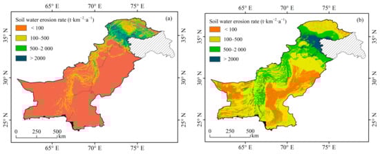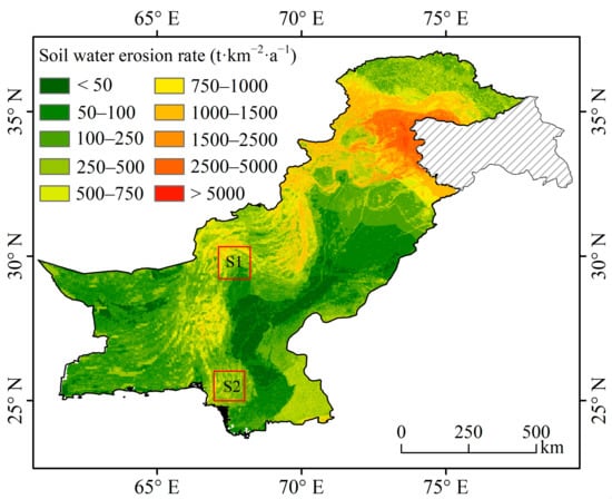 Geographical distribution of the soil erosion rates in Pakistan (S1, S2 represent sample 1 and sample 2, respectively).