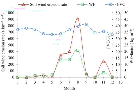 Figure 8 shows three risk regions: (1) The Potohar Plateau and neighboring mountainous areas that are the main agricultural regions, with soil types dominated by cambisols and calcisols and which have greater soil water content, viscosity, and soil quality. However, the topography is undulating (Supplementary Figure S1c), and human activities are frequent, such as deforestation. The R-factor has a maximum value of 5534 (MJ·mm·ha−1·h−1·a−1), which is approximately eight times more than the average rainfall erosion force of Pakistan (717.16 MJ·mm·ha−1·h−1·a−1) (Supplementary Figure S1a). Under the interaction of natural circumstances and human activity, these regions have drastic soil water erosion, with an erosion rate of 2500–5000 t·km−2·a−1. (2) The Kharan Desert and Thar Desert have abundant sand dunes, sparse vegetation, high evapotranspiration, and little precipitation. Arenosols and gypsisols are the most common soil types, which have a high sand content, low clay content, loose texture, increased wind erosion, and soil erosion rates exceeding 15,000 t·km−2·a−1. Wind velocity, temperature, precipitation, soil moisture, etc., variables have a close relationship with soil wind erosion [20]. Wind transfers surface soil and sand, which directly influences wind erosion [65]. Variations in precipitation and temperature influence soil wetness and plant growth, which have a compounded effect on soil erosion [66]. Surface moisture enhances the cohesion of soil particles, thus improving soil resistance to wind erosion and moderating soil wind erosion. Different soil textures have varying degrees of stability and cohesiveness; the higher the silt content and clay content, the more resistant the soil is to erosion [35]. Vegetation functions as a sand consolidator and prevents soil erosion by altering the roughness of the ground and controlling wind speed [50]. Figure 9 compares the SIER with the FVC- and WF-factor on monthly scales; the EF-, SCF-, and K′-factors were considered static and do not change on monthly scales. Soil wind erosion mainly occurs in summer, which corresponds with the seasonal winds of Pakistan, and it is highly consistent with the monthly trend of the WF-factor. Soil wind erosion is most prevalent in desert regions, where vegetation is sparse; the changes on a monthly scale were not significant, and the restraining effect on wind erosion was not obvious. (3) The SAERs of S1 and S2 in Figure 5 were 460.31 t·km−2·a−1 and 381.06 t·km−2·a−1, respectively. However, under the wind–water multiplex effect, the soil erosion rates of S1 and S2 in Figure 7 were 8038.73 t·km−2·a−1 and 9155.63 t·km−2·a−1, respectively, which were very strong. As a consequence, S1 and S2 should be prioritized in soil erosion management, and the soil erosion rates of other regions do not change significantly after spatial overlay.