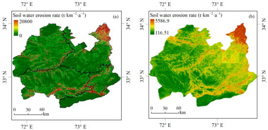(1) Comparison with the small watersheds indicated that the SAER in the current study were closer to the local sub-basins; however, the findings of Gilani et al., (2021) were measured to be less than the local sub-basins [21,22,23,24,25] (Supplementary Table S3). The current study was compared with maps of the SAER in the Potohar Plateau region [25] (Figure 10a,b), which revealed that the macroscopic pattern was similar, with the severest soil erosion being in the northeast and lighter soil erosion being in the southwest. When comparing the classification of the SAER between Ullah et al., (2018) and the current study, 69.25% of the Potohar Plateau has an erosion rate of less than 200 t·km−2·a−1 according to Ullah et al., (2018) [25] (Supplementary Table S4). However, according to the field investigated by Chen et al., (2021) in the Potohar Plateau [28], the results of Ullah et al., (2018) were mainly lower because the R-factor was calculated using the annual precipitation and because the erosive force of extreme precipitation was not taken into account, resulting in a lower value. Among the 15 sub-watersheds investigated in the ground by Chen et al., (2021), 60% of the average SAER was 500 to 2000 t·km−2·a−1, and 59.50% of the erosion rates in this study were between 500 and 2000 t·km−2·a−1, showing that the current study’s results were more in line with the field surveys.