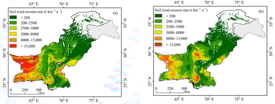 The mean SIER was 2063.45 t·km−2·a−1, with the soil wind erosion amounting to 1.77 × 109 t·a−1. An SIER of less than 200 t·km−2·a−1 covers about 46.52% of Pakistan but only accounts for about 0.53% of the total soil loss; this is found in the Potohar Plateau south of the northern high mountains, which has irrigated fields in the center and southern areas, and coastal regions in the south, where they are most prevalent. These regions mostly consist of cropland and grassland, and their vegetation coverage was greater and more resistant to wind erosion. The percentage in the range of 250–2500 t·km−2·a−1 was 29.27%, and those of 2500–5000 t·km−2·a−1 and 5000–8000 t·km−2·a−1 were 9.47% and 7.06%, respectively. Although an SIER of more than 8000 t·km−2·a−1 covers approximately 7.68% of Pakistan, it accounts for approximately 47.08% of the total soil loss, which is mainly found in the Kharan Desert and Thar Desert. Referring to the method of the global soil organic carbon map evaluated by Hengl et al., (2017), Pakistan was extracted, and the amount of soil organic carbon caused by soil wind erosion was calculated to be about 1.43 × 106 t·a−1 using the methodology of Borrelli et al., (2018) [55].