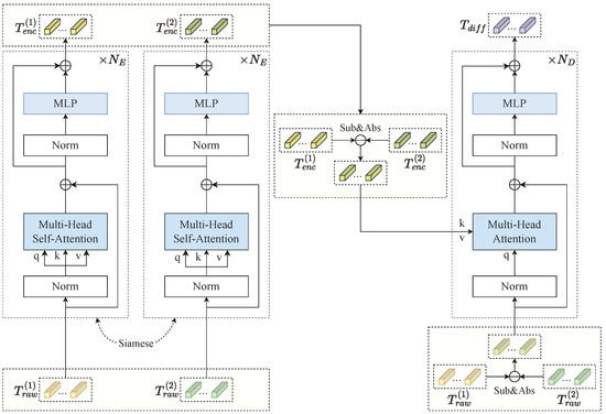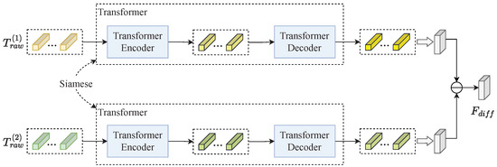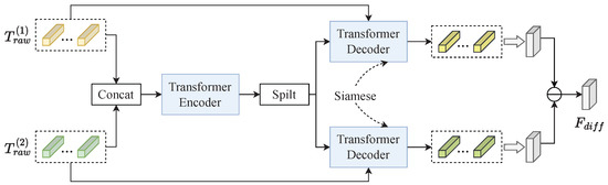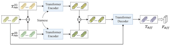 To capture strongly discriminative semantic information, the transformer decoder projects encoded tokens back into pixel space, resulting in refined feature representations enhanced with spatio-temporal context. In the proposed transformer module (see Figure 3), the embedded tokens and derived from features and , respectively, as well as encoded context-rich tokens and are passed to the transformer decoder to develop correlations between each pixel of differential features and encoded differential tokens. In practice, the raw tokens and and encoded tokens and are performing absolute differences separately and input into the transformer decoder to directly generate pixel-level highly discriminative differential features.