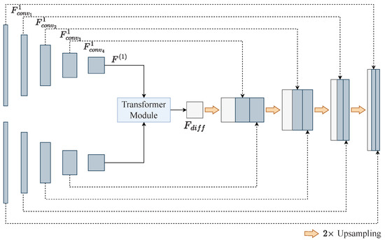 The cascaded decoder consists of four upsampling blocks arranged in a series, as illustrated in Figure 1b. In each upsampling block, the differential features are upscaled and concatenated with the features extracted by the Siamese backbone to learn multilevel representations. A more intuitive description is shown in Figure 4.
