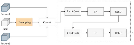 where denotes upsampling operation on the input, and refers to the concatenation of the upsampled input, feature1, and feature2 in the channel dimension.
