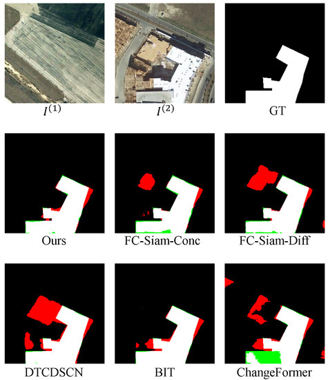These methods mentioned above include three purely CNN-based methods (FC-EF, FC-Siam-Conc, and FC-Siam-Diff), three attention-based methods (STANet, DTCDSCN, and IFNet), and two transformer-based methods (BIT and ChangeFormer).