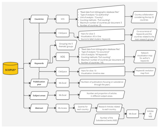 The whole database was downloaded from Scopus. Given the large amount and variability of data obtained, it was necessary to process them according to conceptual schemes and make use of specific software, according to the workflow in Figure 2.
