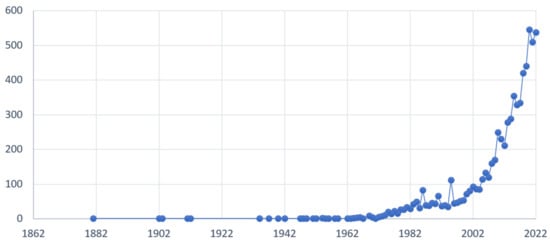 Further screening was based on the type of publication. Only articles, conference papers, reviews, and book chapters in the English language were considered (Figure 1). The database was last updated on December 2022 and the final number obtained is 7140 publications, covering the period between 1881 and 2022 (Table S1). The information obtained is about the temporal development of the search, the geographical origin, and the area of study of the research, and finally the analysis of the keywords. Data were also obtained by analyzing abstracts.