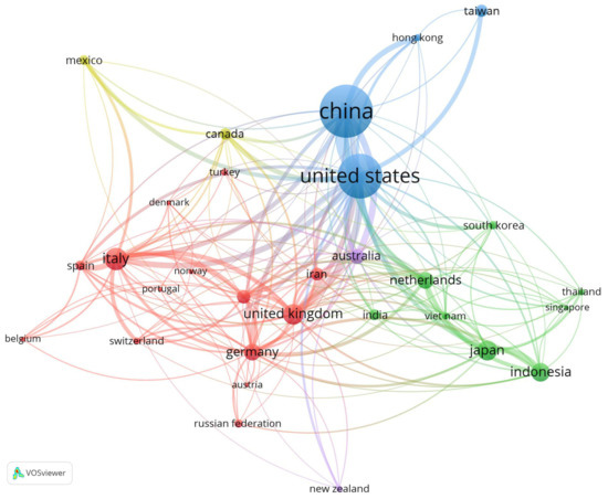 The different colors in Figure 6 highlight three main clusters among the considered countries [79]. The main cluster (shown in blue) consists of China and the United States, as already discussed above. The second one (red) is mainly formed by European countries, with a significant contribution from Italy, France, the UK, and Germany, and some Asian countries. The latter populated almost all of the third cluster (green) together with the Netherlands. One minor cluster (violet) has its core in New Zealand and shows itself as well-distanced from the other clusters with few publications and poor connections.