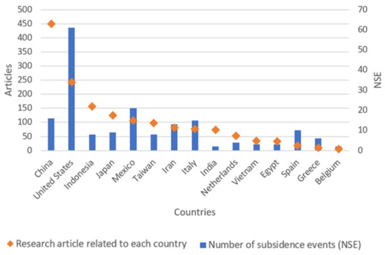 Relationship between the number of subsidence events (NSE) and the number of research articles related to each country.