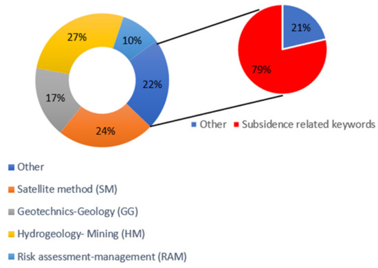 Four groups include items with specific reference to (i) Satellite Methods (SM), (ii) Geotechnics-Geology (GG), (iii) Hydrogeology-Mining (HM), and (iv) Risk Assessment-Management (RAM). All keywords that were not strictly related to the previous, were grouped into an “Other” category. The keywords subsidence and land subsidence were included in the latter group since they characterize the phenomenon in general and the analysis aimed to highlight the relationship between the phenomenon itself and the study approaches. The group with the greatest co-occurrence of keywords is that relating to HM, with 27%, demonstrating that most of the studies address the origin of the phenomenon above all to extraction and mining activity. SM follows, with 24%, although the frequency of these words is documented largely from the end of the 20th century, thanks to the development of satellite surveying techniques, as previously mentioned. The inclusion of the terms subsidence and land subsidence brings the Other group to 22%, but these two keywords represent about 79% of the group itself. The contribution of the geological and geotechnical component (GG group), also transversal to SM and HM, is on the order of 17%, while RAM includes 10%.