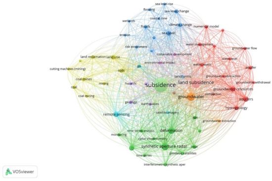 Another important group of keywords is the one related to satellite methods to study and monitor the phenomenon of ground deformation. Synthetic aperture radar (SAR), inSAR, interferometry, and deformation are the most frequently recurring keywords, among others. They represent specific useful tools to monitor large areas and provide digital elevation models (DEMs) [86,87,88]. The green cluster contains the most used items in this field and shows good relationships, especially with the keywords that refer to hydrogeology.