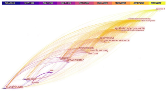 Between 1934 and 1943, the main keyword obviously is subsidence; in the following decade, the phenomenon is associated with variations in sea level, in order to understand the relationship between these two events [89] and the problem of coastal erosion, which is seen as evidence of the occurrence of subsidence [90,91]. The main keyword during the decade from 1957 to 1966 is map, replaced in the following years by words relating to the aquifer, especially its variation, whether due to extraction [92] or compaction [93]. After this time, the focus shifts to understanding the effect of land use on LS [94,95] and to the first applications of remote sensing to measure the phenomenon [96]. This represents the beginning of a new phase of studies on evolving technologies, which from the 1990s onwards began to dominate subsidence research, sometimes accompanied by themes such as sustainable development, in particular on sustainable groundwater management [97,98,99] or urban development, to study the connection between urbanization and ground sinking [100,101,102].