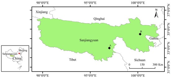 Sanjiangyuan National Nature Reserve (89°45′–102°23′E, 31°39′–36°12′N) in Qinghai Province, China. Two black diamond marks A and B represent the location of the dataset: mark A in the middle of Sanjiangyuan is located in Yushu County, Qinghai Province; mark B in the eastern part of Sanjiangyuan is located in Guoluo County, Qinghai Province.