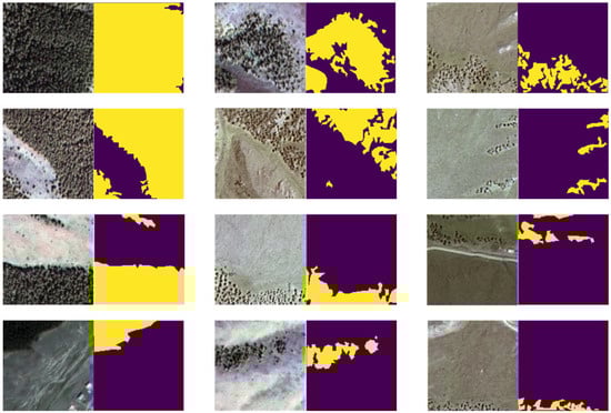 The large-scale plateau forest dataset in Sanjiangyuan was proposed by Wei et al. [29] and contains 38,708 remote sensing imagery samples and 1187 accurate manual ground truth forest segmentation labels of 128 × 128 pixels at a 2 m spatial resolution from the ZY-3 satellite. Table 1 shows the detailed information from the ZY-3 satellite data. These imagery samples were from Yushu County and Guoluo County, as shown in Figure 1. Table 2 shows the detailed information of the dataset. The dataset contained a rich variety of plateau forest types at different densities, surrounded by a variety of land cover environments. The visualization of some remote sensing image samples and their ground truth label data are shown in Figure 2. As shown in Figure 2, it is clear that the distribution of forests varies considerably among samples. This variation can be observed in various aspects, such as the extent of forest cover, forest density within each sample, and the surrounding environment. The complexity of this dataset is well represented. Such variations in the forest distribution can pose a significant challenge to the accurate segmentation of remote sensing images. It is, therefore, essential to develop effective image analysis techniques that can handle such diversity and variability in the data to achieve reliable and consistent results.