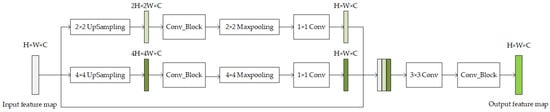 As shown in Figure 6, the input feature map was operated by bilinear interpolation of sizes 2 × 2 and 4 × 4 for upsampling. The size of the input feature map was expanded to 2 and 4 times of the original input feature map, respectively. Then, the detailed feature information was extracted by the convolution block for each of the two different scales of amplified features, and then their size was restored by Maxpooling of sizes 2 × 2 and 4 × 4, respectively, followed by one-layer convolution with a kernel size of 1 × 1 with ReLU activation function to map the two features with the same size as the original input feature map. After that, we concatenated the two amplified features and the original input feature map, followed by one-layer convolution with a kernel size of 3 × 3 with ReLU activation function. Some semantic information from the encoder was retained during the extraction of detailed information from the amplified features. Finally, a convolution block was used to map the output feature map to the same size as the original input feature map.