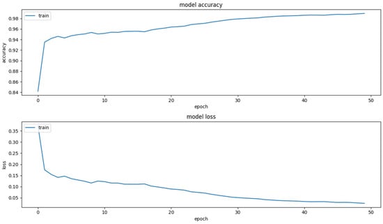 As can be seen in Figure 8, the two curves show the variation in the accuracy and the loss of the training model on the train set, respectively. After 50 epochs of training, we can clearly see that both the accuracy curve and the loss curve have reached a satisfactory state. In addition, the loss curve increased slightly three times in the first 20 epochs of the start, and the accuracy curve was accompanied by a slight decrease. Overall, both the accuracy and loss curves show good trends, reflecting the good convergence of the proposed forest remote sensing image segmentation network.