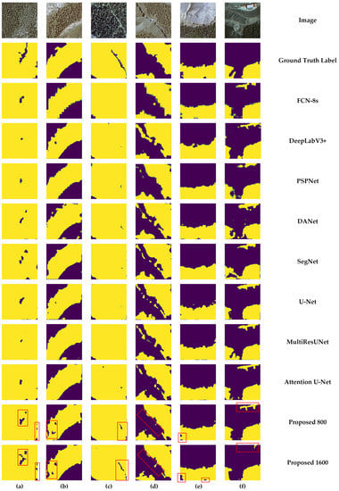 The visualization of the comparison of the forest segmentation results of different algorithms. Rows from the top to bottom represent the original images, the corresponding ground truth labels, segmentation results of FCN-8s, DeepLabV3+, PSPNet, DANet, SegNet, U-Net, MultiResUnet, Attention U-Net, proposed network trained by 800 samples, and proposed network trained by 1600 samples (expanded by proposed data augmentation), respectively. The subfigures (a–f) are representative of the segmentation results of six different areas. The results shown in the red square demonstrated the effectiveness of the proposed method.