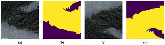 The visualization effect of remote sensing image and flipped image with their ground truth labels. (a) original forest remote sensing image; (b) ground truth label of the original forest remote sensing image; (c) remote sensing image after flipping; (d) ground truth label of the remote sensing image after flipping.