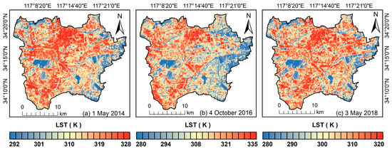 Figure 4 illustrates the remote sensing inversion results of the LST during three phases, with average surface temperatures of 305 K, 309 K, and 305 K, respectively. The LST spatial distribution patterns during these three periods highlight that regions with higher LST are primarily concentrated in impervious surfaces, including commercial, industrial, and residential areas. Conversely, regions with lower LST are mainly present in vegetation-covered regions, including urban forests, grasslands, green belts, and suburban farmlands. This distribution indicates the potential alleviation impact of green space on the UHI.