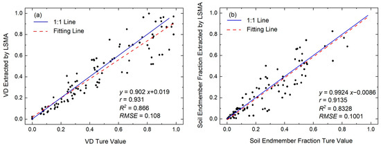 Validation results of VD on 4 October 2016: (a) accuracy of VD extraction and (b) accuracy of soil endmember extraction.