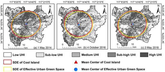 The standard deviational ellipse (SDE) indicates the primary direction and dispersion of geographic element distribution [53]. The LSTs of three phases were also divided into five UHI levels through the mean standard deviation method (Table 4), with low and sub-low LST patches designated as cool islands. SDEs were then calculated for effective green space (SDEg) and cool islands (SDEc), respectively. Figure 7 shows that the SDEg and SDEc of each period had a high degree of coincidence. Additionally, the mean centers of effective green space and cool islands for each phase were very close, with distances of 370.8 m, 1006.5 m, and 498.1 m, respectively. These results suggest a similar spatial distribution between effective green space and cool islands, supporting the preliminary evidence of the alleviation impact of green space on the UHI.