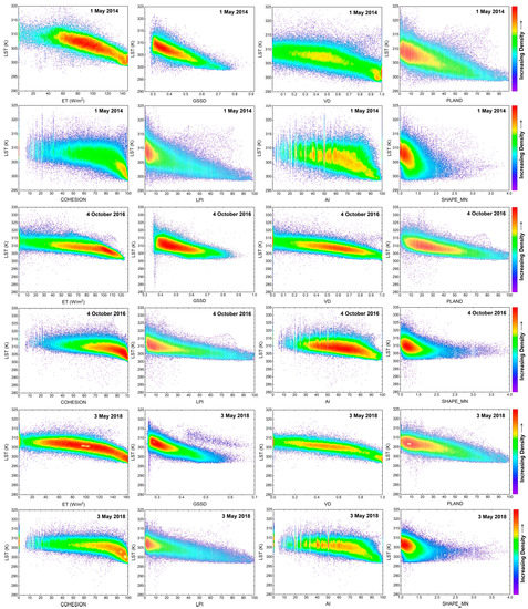 Scatter density diagrams of LST versus the green space factors of ET, GSSD, PLAND, COHESION, AI, and SHAPE_MN of three phases.