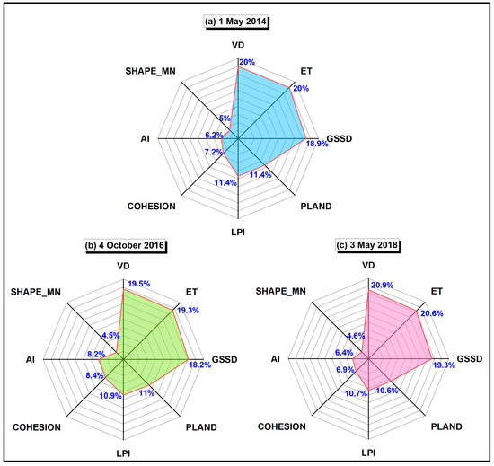 The Wj for the three periods in descending order are VD ≥ ET > GSSD > PLAND ≈ LPI > COHESION > AI > SHAPE_MN, and the vegetation factors of urban green space (VD, ET, and GSSD) contribute more to UHI mitigation than its spatial pattern factors (PLAND, LPI, COHESION, AI, and SHAPE_MN). In addition, the weight values differed slightly (0.1% to 0.5%) between VD and ET, PLAND and LPI, and COHESION and AI, indicating that each pair of factors had a similar contribution to mitigating the thermal environment.