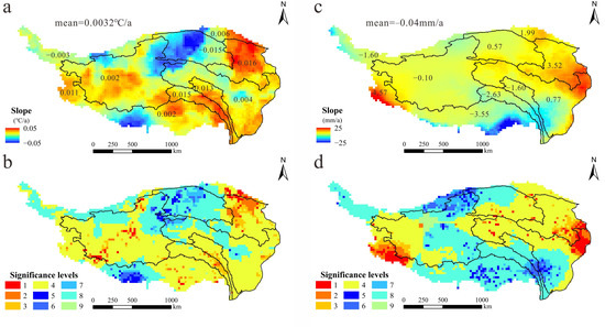 Spatial characteristics of climate change from 2003 to 2021. (a) Spatial distribution of slope of annual mean temperature; (b) spatial distribution of significant changes in annual mean temperature; (c) spatial distribution of slope of annual precipitation; (d) spatial distribution of significant changes in annual precipitation.