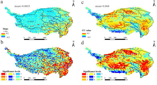 As shown in Figure 3a,b, the changes indicate that the temperature increased in 64.1% of the TP and decreased in 35.1% of the TP. The areas where the temperature increased were mainly distributed in the YRB, the L-MRB, the N-SRB, the S-IRB, the east of the YB, the east of the YZ-BRB, and the south of the IB. The increase rate of the temperature in the YRB was 0.016 °C/a. Additionally, 89.0% of the YRB showed an increasing trend. The decrease rate of the temperature in the QB, in which 88.3% showed a decreasing trend, was −0.015 °C/a.