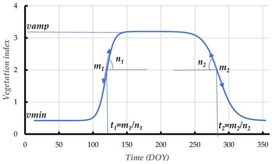 where V(t) stands for a given vegetation index at time t, vmin, and vamp are minimum (background greenness) and amplitude parameters of one year, respectively, m1, n1, m2, and n2 are parameters controlling the curve shape (Figure 3). Some critical points are important to highlight as t1 = m1/n1, which is the inflection point within the growth period, while t2 = m2/n2 corresponds to the inflection point at the end of the season during the leaf senescence phase. Quantities t1 and t2 can be used as proxies of the start of the season (SOS) and end of the season (EOS), respectively [53]. Parameters n1 and n2 reflect the slope at the inflection points, t1, and t2.