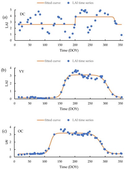In our study, vegetation indices time series were fitted to an analytical model that represents the development of plants in relation to their phenology and uses the parameters of such relationships (PM) as a classifier used in the land classification. This is a significant variation from conventional classifiers, which target directly vegetation indices or diffusion of surface reflectance. The double sigmoid fitting function shown in Equation (1) [51,52] was fitted to the raw vegetation index time series using a non-linear least squares method (nls function in R).