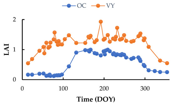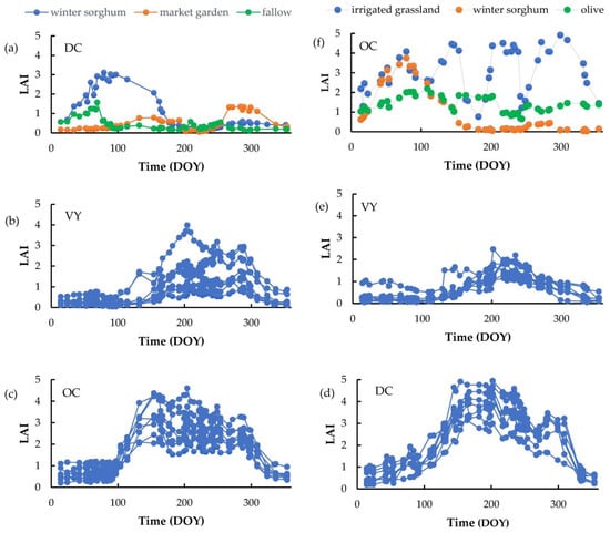 In both areas, OC and VY trees are deciduous and therefore exhibit a similar temporal pattern that is characterized by a maximum plateau in the summer. However, despite the close resemblance in the temporal patterns, there are still some significant features that can be used to separate them. For instance, OC trees mostly have SOS during 60–80 DOY and 100–120 DOY time intervals in the Crau and Ouveze-Ventoux areas, respectively. With VY, such intervals are delayed by about 30 days in both areas (Figure 5). Moreover, the growth rate in vineyards is more gradual. The differences between the areas are explained by the type of orchards and the climate, with the Ouveze area being located more to the north with higher altitudes and thus lower temperatures, which induce delays in phenology. The level of the plateau is variable. It depends on the age and density of the stands. However, in general, the values obtained in summer by the VY remain lower than those of the OC, except for the irrigated VY dedicated to table grapes. The LAI variations in mid-season can be variable according to inter-row management and pruning practices. For a given field, the temporal features remain rather stable between years, meaning that the classification algorithms might be applied over different years.