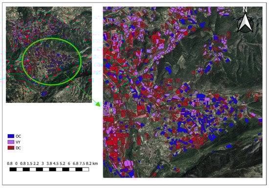 Spatial distribution of OC, VY, and DC classes in the Ouveze-Ventoux site for the year 2021.