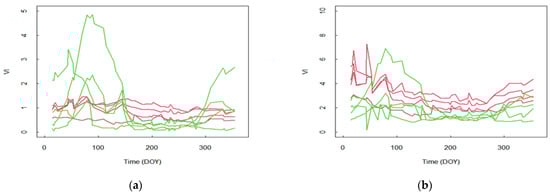 Vegetation indices time series observed on OL plots (red) and DC (green). In (a), the vegetation indices are the LAI; in (b), the vegetation indices are GCVI.