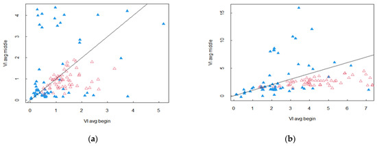 Average vegetation indices during the summer period (DOY 150–250) as a function of the average vegetation indices at the beginning of the year (DOY 1–100) for olive plots (red triangle) and end DC plots (blue triangle). In (a), the vegetation indices are the LAI; in (b), the vegetation indices are GCVI.