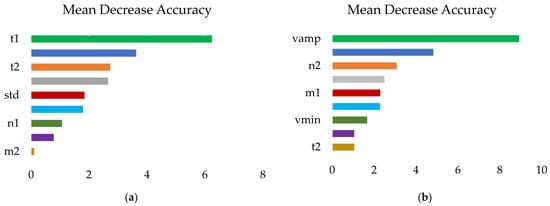 This feature importance process in the RF algorithm involves building a classification and regression tree to create OOB (out-of-bag) sample data. According to the OOB data, the RF algorithm can confirm the significant (importance) role of the input data and generate each feature’s important score, which is displayed as MDA (mean decrease accuracy). The principle is to convert a feature’s value to a random number, compute its influence on the model’s precision, and quantify the parameter’s importance according to the MDA value generated from several computations. When the value is higher, the importance variable also becomes higher [59]. Both in Ouveze-Ventoux and Crau t1 and vamp are the two most significant feature variables, showing the importance of the start of the season and the amplitude of variation of the LAI signal (Figure 10). On the contrary, the EOS, as reflected by t2, had a lower impact on the classification.
