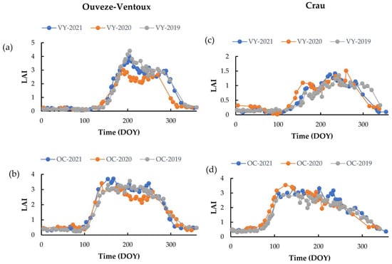 Temporal profile of OC and VY in Ouveze-Ventoux (a,b) and Crau (c,d) study areas from 2019 to 2021.