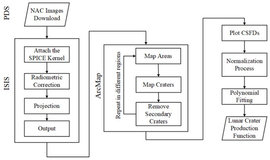 To establish the lunar crater PF, the first step was to map the crater populations and measure their diameters in different geologic regions. The NAC images were processed using the Integrated Software for Imagers and Spectrometers (ISIS) program [26], and then imported into ArcGIS for mapping craters. The procedure of crater CSFD measurements has been detailed in several previous studies [4,27]. In summary, in order to obtain the crater CSFD of a geological unit, we firstly had to determine the surface area of the geological unit, and then measure the diameters of each primary impact crater within the unit. The crater CSFDs from different areas were subsequently normalized, and the lunar crater PF was finally obtained by fitting the normalized CSFD with a function. The overall workflow is shown in Figure 1.