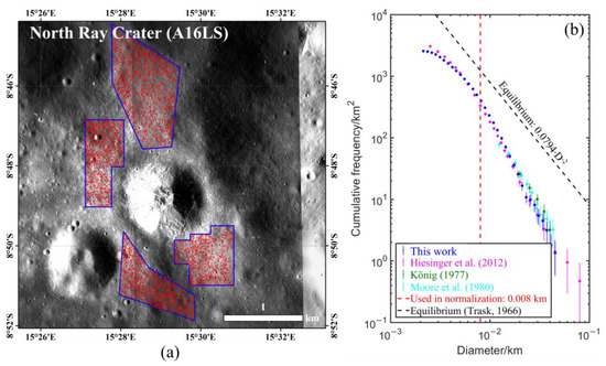 Counting area and mapped craters in the ejecta of North Ray crater and the corresponding CSFD in comparison with König [15], Moore et al. [47], and Hiesinger et al. [44]. (a) Counting areas (encircled by the blue polygons) and mapped craters (shown in red circles) in NAC image pair M129187331. (b) The CSFD derived in this study (blue) in comparison with that of König [15] (green), Moore et al. [47] (cyan), and Hiesinger et al. [44] (purple). The lunar equilibrium function [41] is shown by the black dashed line.