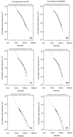 Cumulative fit by new PF (left column) and cumulative fit by NPF2001 (right column). (a,b) Crater CSFD of pre-Nectarian terrains; data can be found in Marchi et al. [65]; (c,d) crater CSFD of Nectarian basin; data can be found in Marchi et al. [65]; and (e,f) crater CSFD of terrestrial craters; data can be found in Earth Impact Database [66].