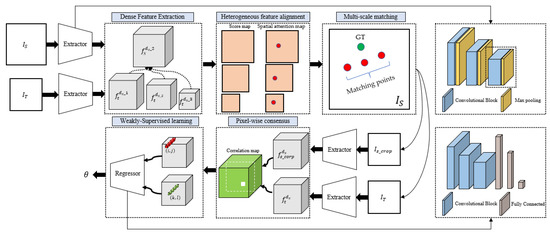 The remainder of this paper is structured as follows. Section 2 details the methods used for feature extraction, heterogeneous feature alignment, multi-scale matching, pixel-wise consensus, and weakly supervised learning. In Section 3, we present the experimental details, the dataset statement, and comparisons of the experimental results with several state-of-the-art methods, including ours. Finally, we provide conclusions in Section 4. An overview of our work is presented in Figure 2.